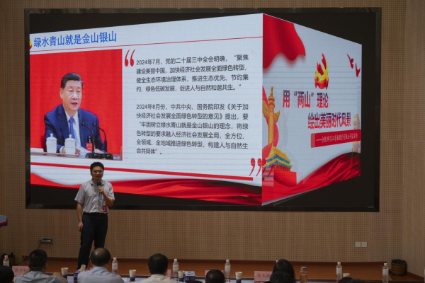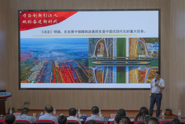 比賽現(xiàn)場,公司第一黨支部張榮強、第二黨支部馬良分別以《用“兩山”理論 繪出美麗時代風(fēng)景》和《守正創(chuàng)新引江人 砥礪前行新時代》為題,圍繞黨的二十屆三中全會精神、習(xí)近平總書記“兩山”理論等內(nèi)容,從“小切口”引出“大主題”,用“小故事”講明“大道理”,展現(xiàn)了公司在服務(wù)保障引江濟淮工程建設(shè)中的責(zé)任與擔(dān)當(dāng);展現(xiàn)了引江投資人全力推進江淮運河沿線生態(tài)、生活、生產(chǎn)融合發(fā)展,積極踐行習(xí)近平生態(tài)文明思想的生動實踐。為現(xiàn)場觀眾呈現(xiàn)出一場接地氣、有溫度、有深度的思政小課堂。